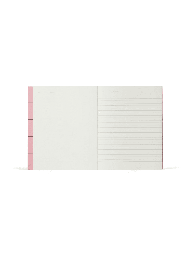 The open notebook presents a blank left page, with a lined right-hand side, leaving space for sketches, mindmaps, notes and doodles.